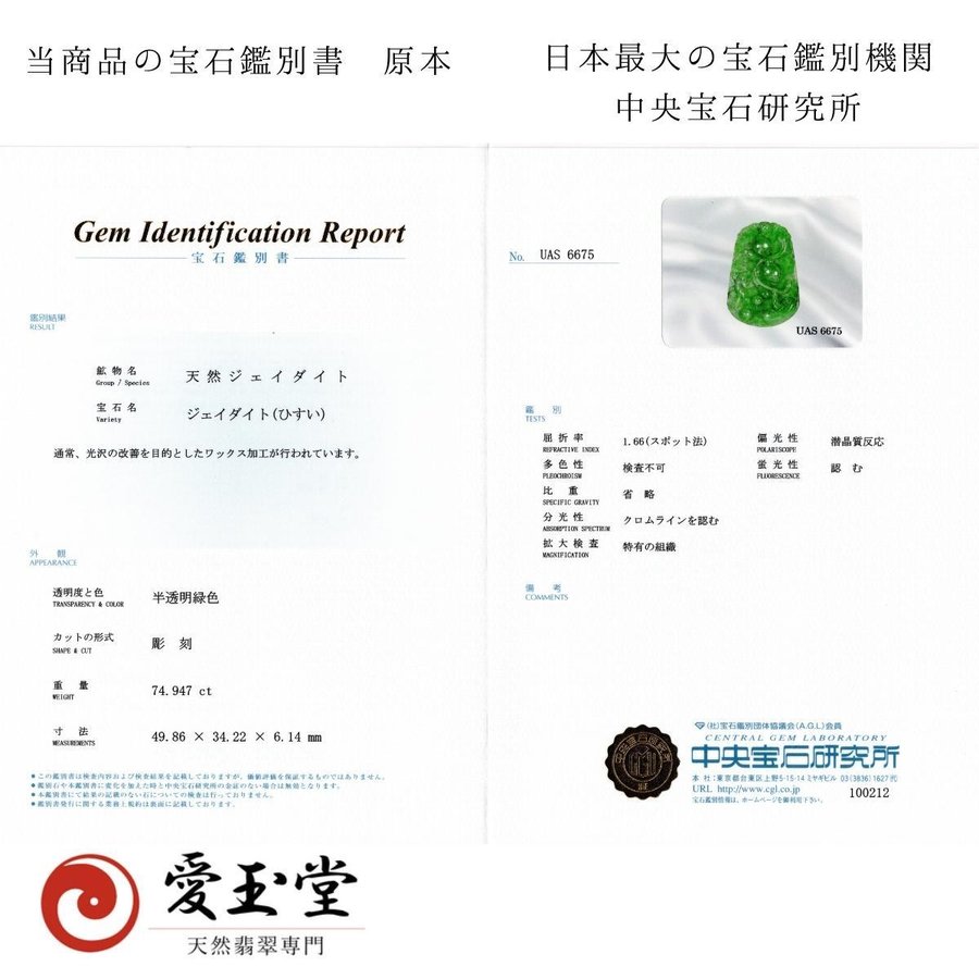 ≪ 中央宝石研究所 ≫ 宝石鑑別書付属